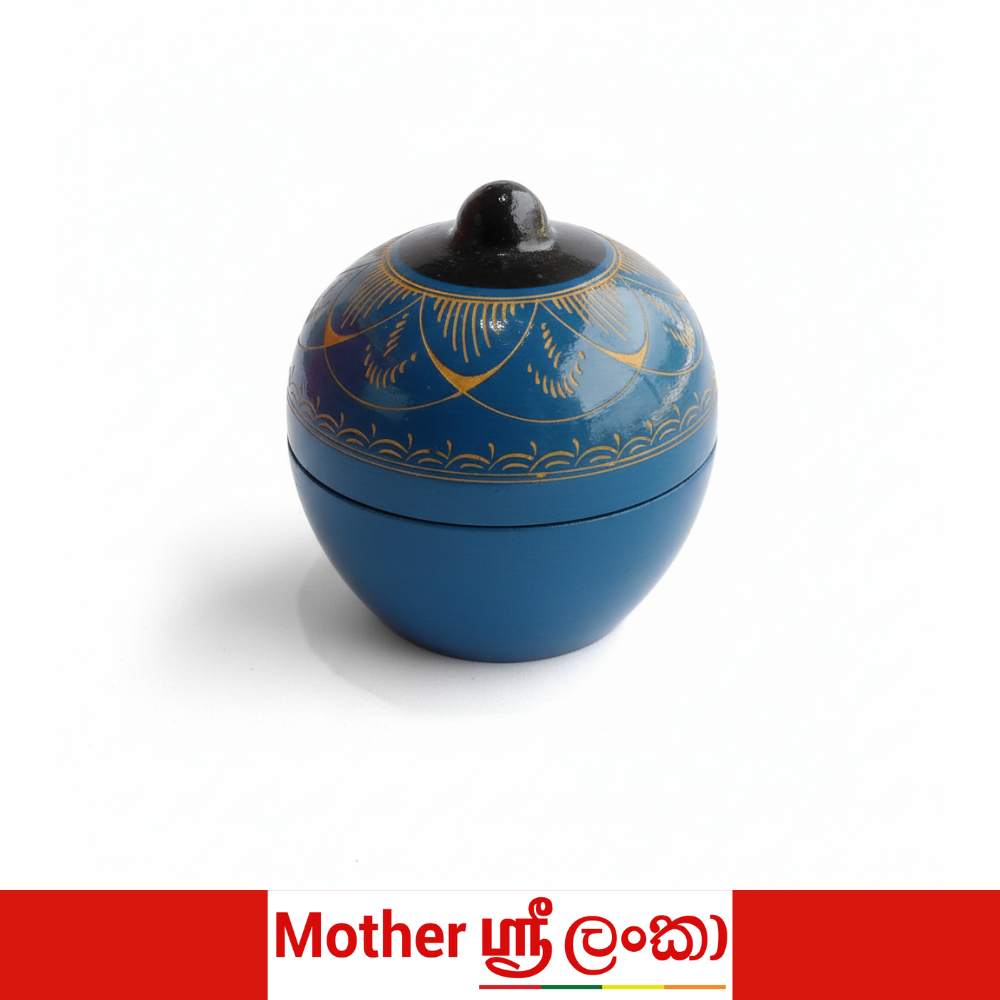 This charming blue lacquerware trinket box highlights traditional Sri Lankan design with ornamental gold detailing. Handcrafted from natural wood and lacquered for a smooth, glossy finish, it’s perfect for storing jewelry, small keepsakes, or sacred items. Its vibrant blue hue and delicate patterns reflect Sri Lanka’s artistic craftsmanship and make it a standout accent piece for shelves, desktops, or coffee tables.