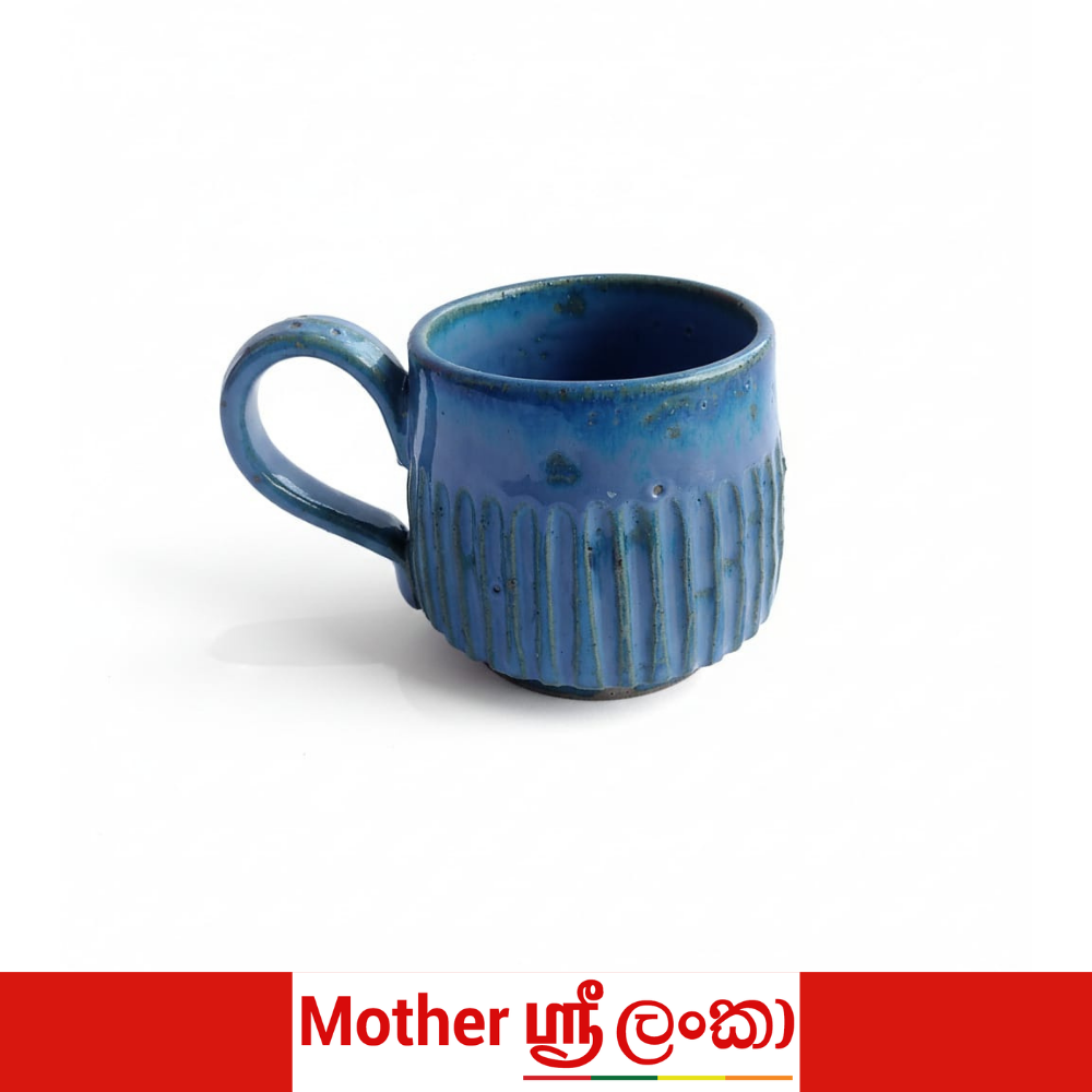 This ceramic mug features a rich blue glaze with subtle natural variations that give each piece a distinctive look. The exterior showcases a vertically ribbed texture, adding visual interest and a comfortable grip. Finished with a smooth, rounded handle and a glossy interior, this mug blends handcrafted character with everyday functionality. Its minimalist yet artistic design makes it suitable for home, office, or café use.