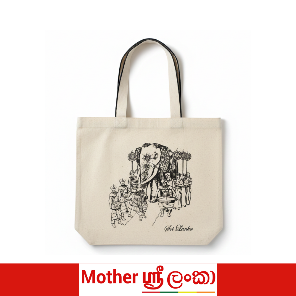 Celebrate the spirit of Sri Lanka with this beautifully illustrated canvas tote bag, featuring a traditional cultural procession led by a decorated elephant. The detailed black line artwork showcases drummers and ceremonial figures, reflecting the island’s rich heritage and timeless artistry. The words “Sri Lanka” are subtly printed below the illustration, making it a meaningful keepsake or gift.