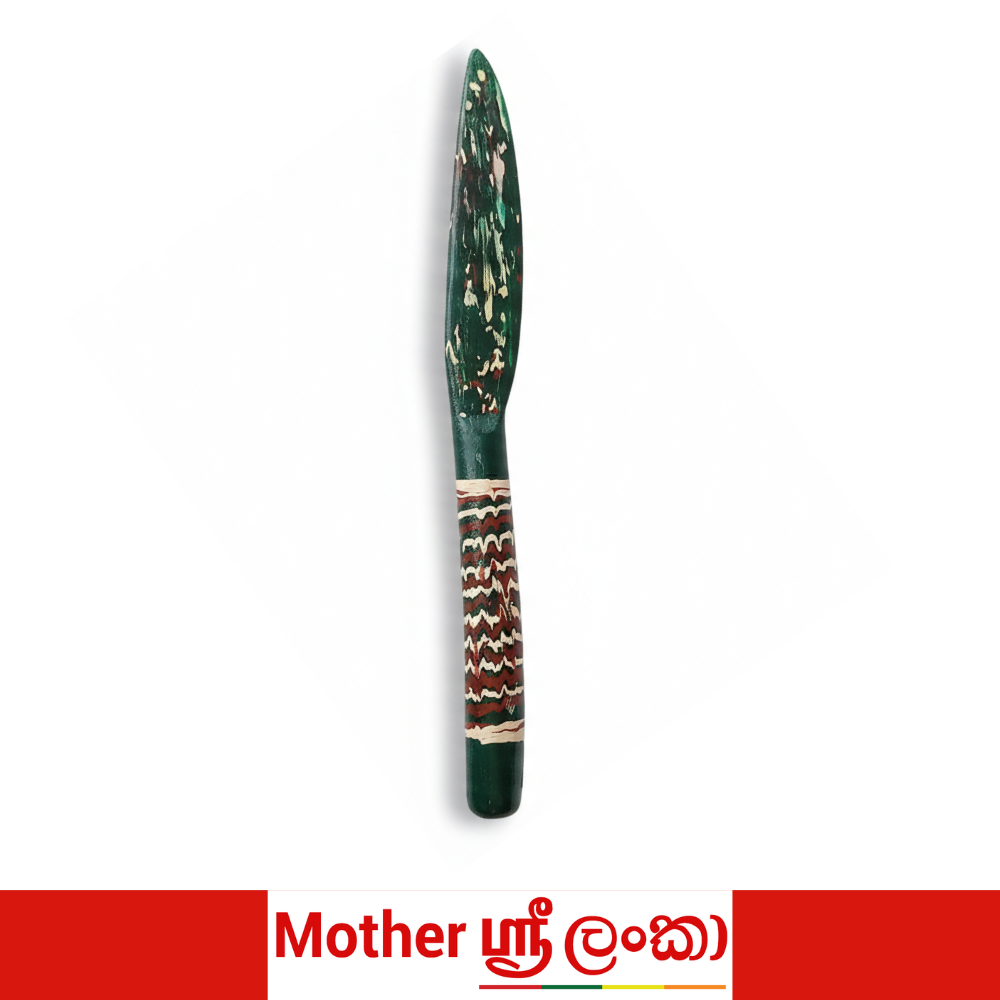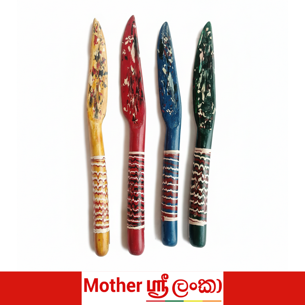 This handcrafted Sri Lankan wooden letter opener is made using traditional carving and hand-painting techniques. Each piece features a smooth, tapered blade for safely opening letters, paired with a beautifully decorated handle inspired by local folk art. Available in multiple color variations, every letter opener has its own unique character, making it both a practical desk accessory and a decorative craft item. Ideal for home, office, or gifting.