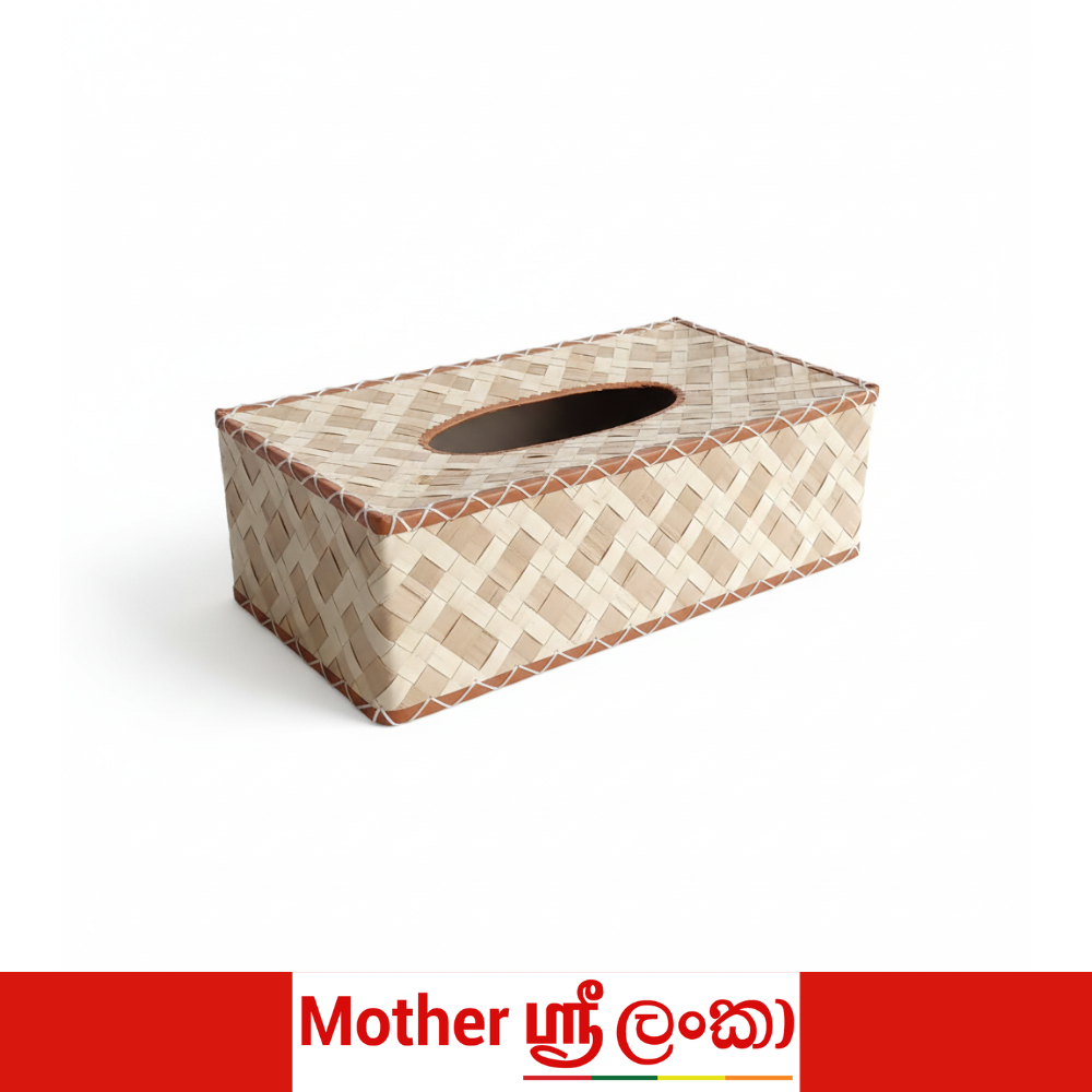 Designed to fit standard rectangular tissue boxes, it features a neatly finished oval opening on top for easy access. The intricate handwoven pattern and reinforced edges highlight the skill of Sri Lankan artisans while ensuring durability for everyday use.