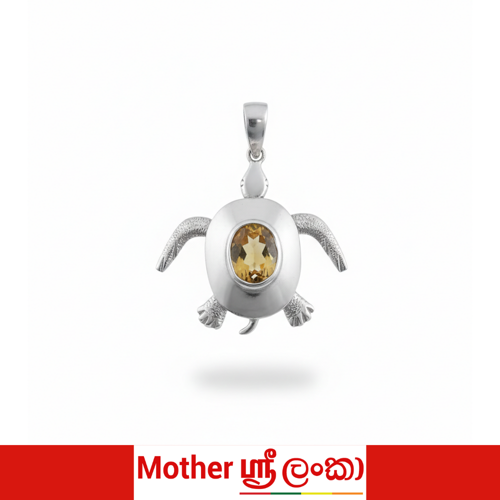 A symbol of longevity and quiet strength, the Silver Tortoise Stone Pendant captures refined craftsmanship in a distinctive silhouette. Sculpted in polished silver, the tortoise form is thoughtfully detailed with softly textured limbs and a smooth, domed shell that frames a warm golden-hued stone at its center.